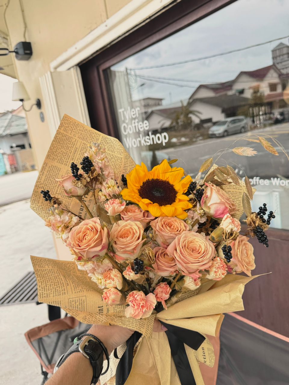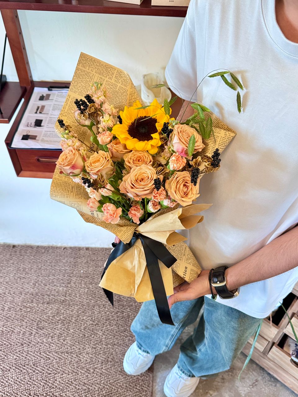 Type of flower: Cappuccino rose , sun flower, carnation, Belamcanda Chinesis (will replace with other fruit type if not available), leaf