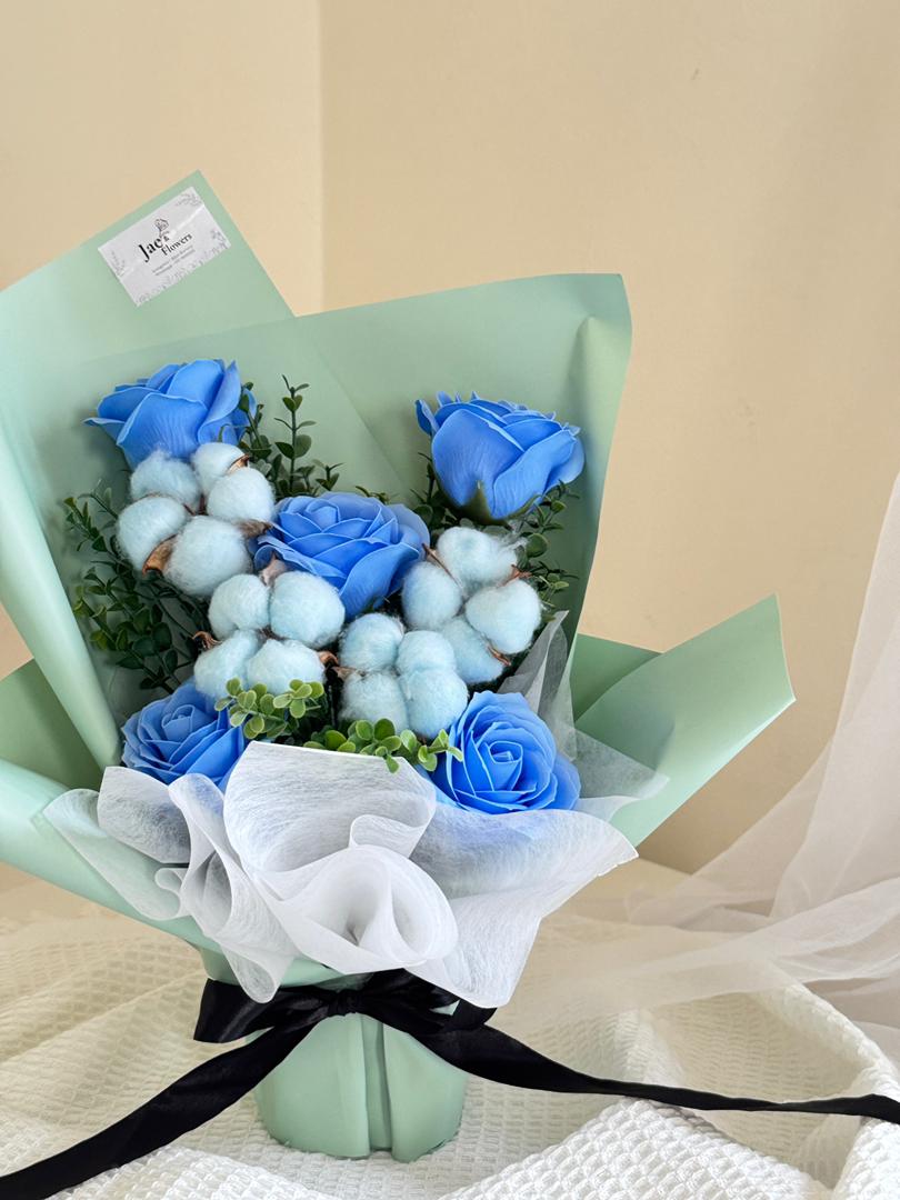 Soft as clouds and serene as the sky, this bouquet pairs striking blue roses with fluffy cotton blooms, creating a dreamy balance of elegance and comfort. Wrapped in gentle mint-green tones, it captures the essence of calmness, purity, and quiet joy. Perfect for expressing heartfelt wishes, celebrating milestones, or simply gifting a touch of serenity to someone special.Please contact our Whatsapp to inquire.0179031628