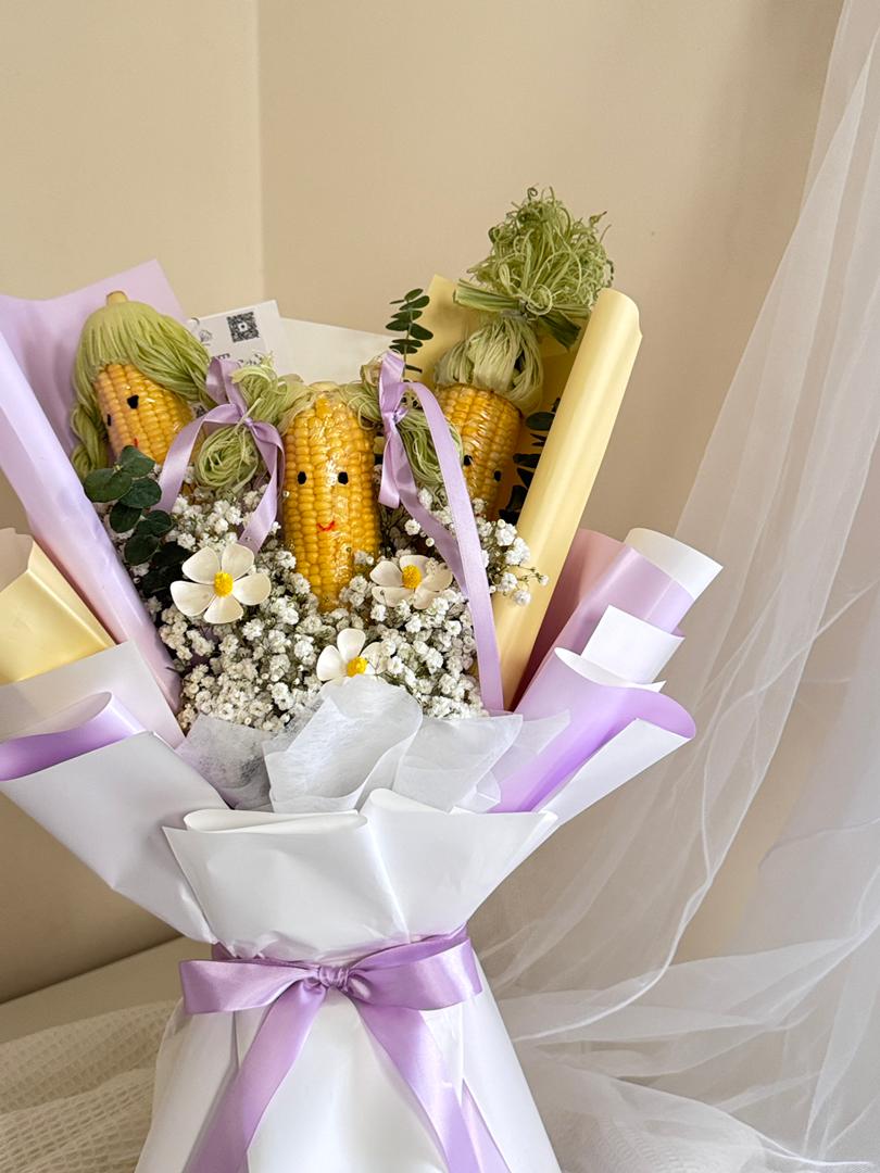 A playful twist on traditional bouquets, featuring fresh corn styled with cheerful faces, paired with delicate baby’s breath and white blossoms. Symbolizing abundance, joy, and prosperity, this unique bouquet makes a memorable gift for openings, celebrations, or simply to bring smiles and good fortune.