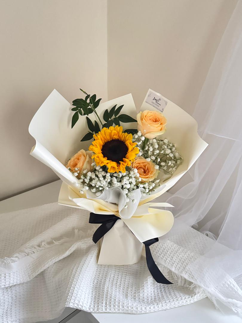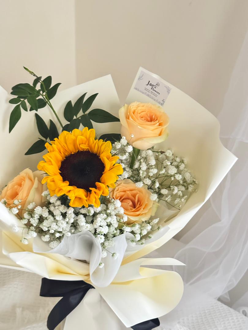 A single sunflower stands proudly at the heart, surrounded by soft peach roses and tender baby’s breath. Wrapped in ivory with a sleek black ribbon, this bouquet balances strength with grace—symbolizing loyalty, admiration, and a quiet kind of love that speaks louder than words. Please contact our Whatsapp to inquire.0179031628