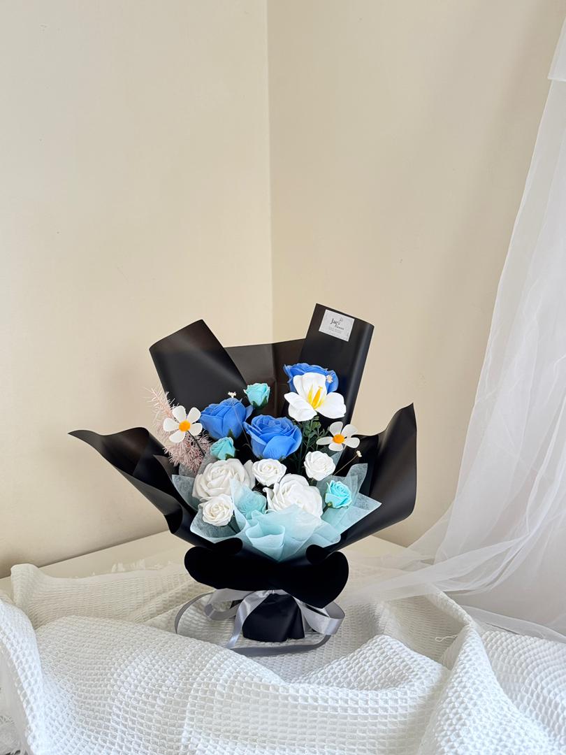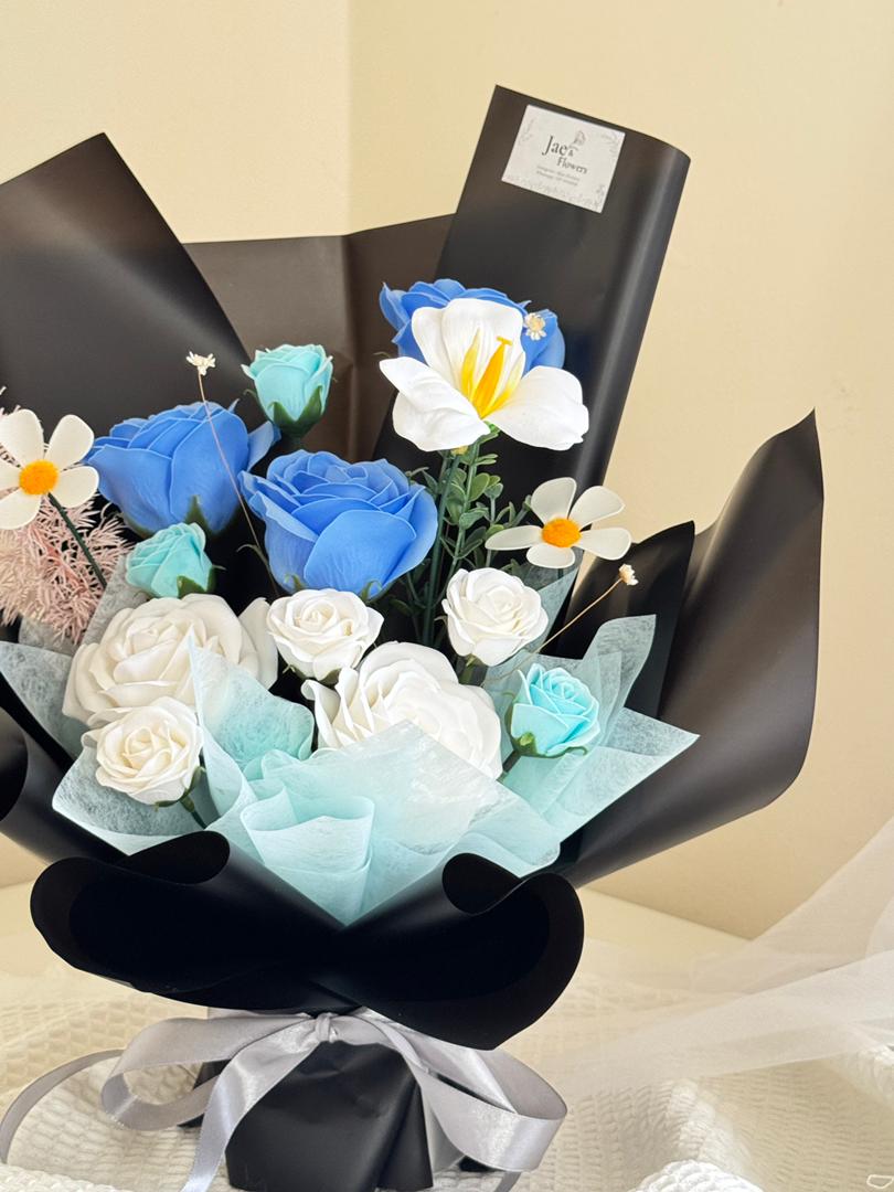 A bold and elegant bouquet crafted in striking shades of blue and white, wrapped in sleek black paper for a modern finish. Featuring vibrant blue roses, delicate white blooms, and cheerful daisies, this arrangement symbolizes trust, serenity, and pure affection. Perfect as a timeless gesture of love, gratitude, or celebration, it blends contemporary style with heartfelt emotion. Please contact our Whatsapp to inquire.0179031628