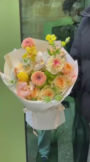 A refined composition of layered peach roses, creamy carnations, cheerful gerberas, and fresh botanical accents.