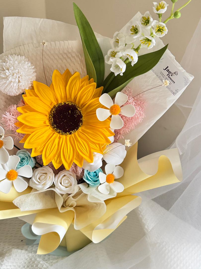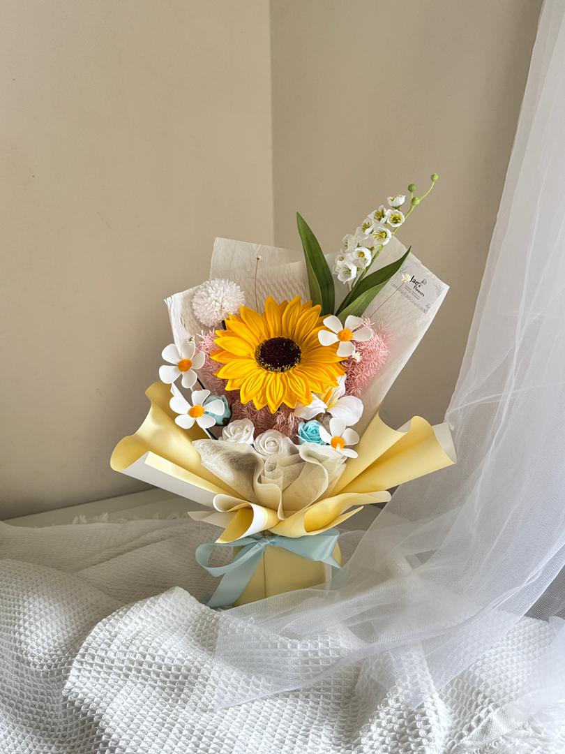 A burst of sunshine in floral form — this bouquet features a radiant sunflower at its heart, surrounded by cheerful daisies, soft roses, and elegant white blooms. Wrapped in gentle yellow and cream tones with a playful pastel bow, it embodies joy, warmth, and positivity. Perfect for brightening someone’s day, celebrating a milestone, or simply saying “you make life sunnier.” Please contact our Whatsapp to inquire.0179031628