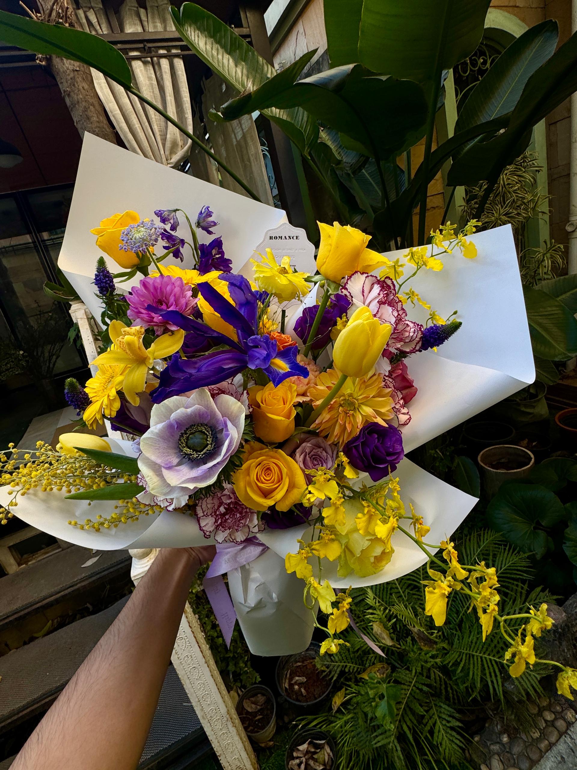 An expressive composition of vibrant yellow roses, striking purple irises, and layered seasonal blooms.